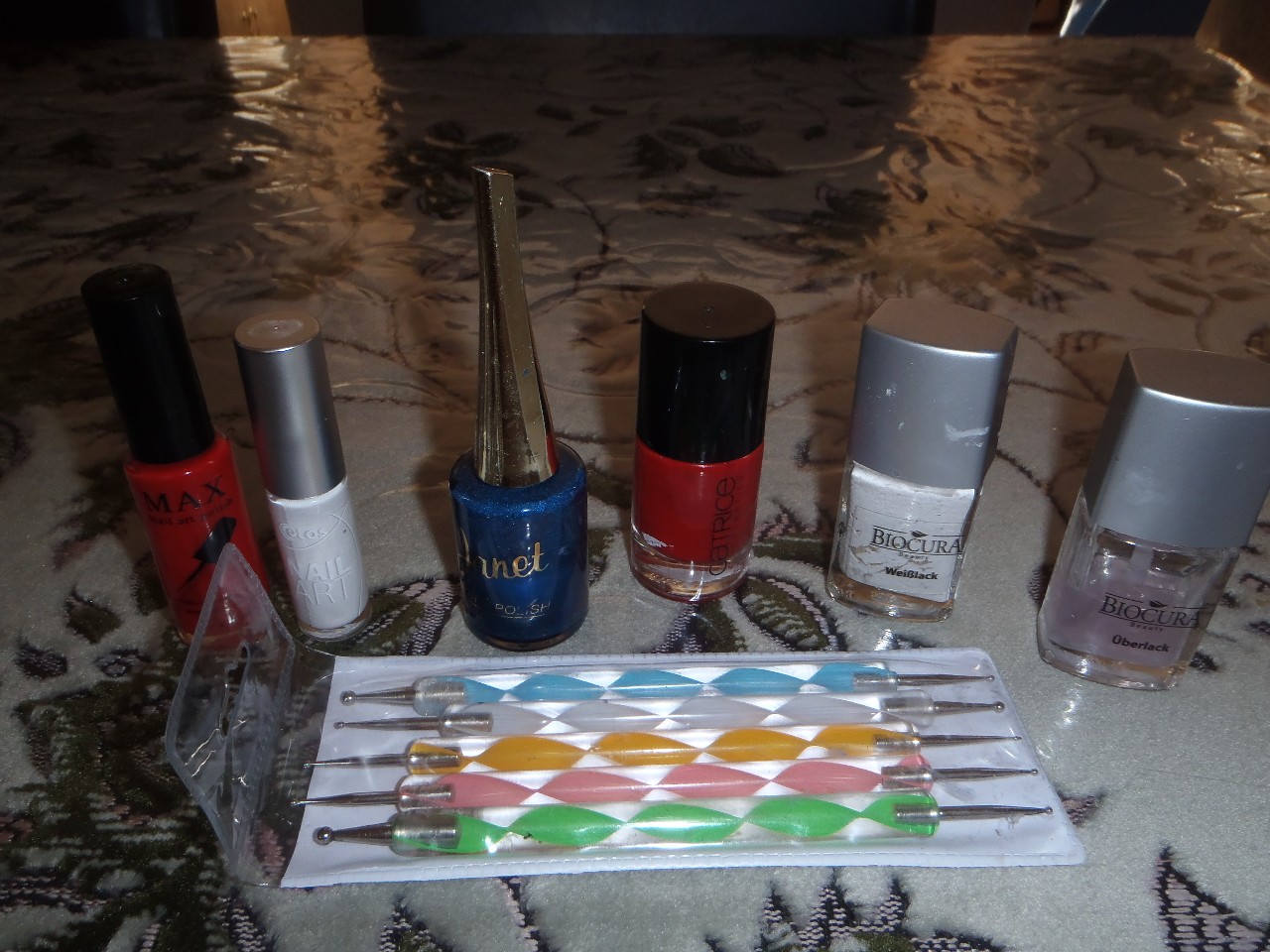 Benodigheden: De spullen die ik had gebruikt zijn :Rode striper van action,Witte striper van de etos, Blauwe Janet luxury polish (gekocht op de markt) ,Witte nagellak van Biocura , Catrice 060 Bloody Mary To Go en Biocura Uberlack (Topcoat) verder nog dotting tools (gekocht via marktplaats) (je kan ze ook nog bij ebay en andere nagellak shops) Let op : alleen via internet te krijg baar!